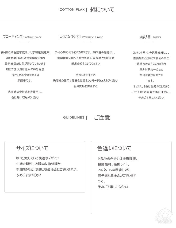 1)商品により多少の誤差(2~5cm前後)が生じる場合がございます。2)実物の色に近くなるよう自然光での撮影を基本にしていますが、お部屋の照明、モニター環境等により色味が若干異なる場合がございます。3)海外製造商品により、お受け取りの際に多少のたたみ皺・糸ホツレ・汚れのある場合がございます、予めご了承ください。4)自然と環境にやさしい簡易梱包にご協力いただきますよう、お願い申し上げます。5)量産服で工場から直接郵送に入るため、穴を開けるのはお客様自分で行うことになっております。